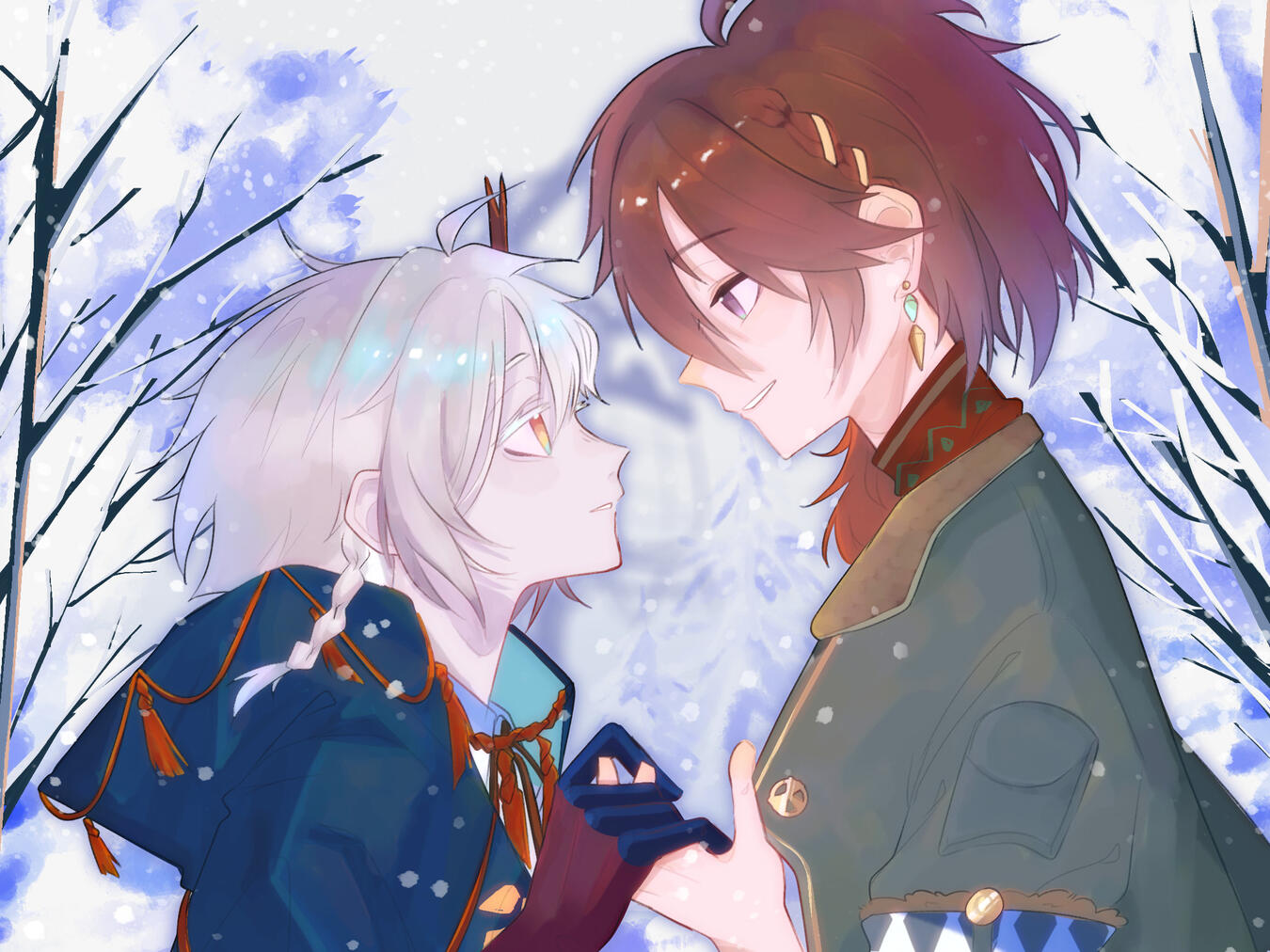 Both of them are way too familiar with the frigid, freezing air. All kinds of memories are carved deep into the snow, be it sweet or bitter. In a fascinating twist of fate, the blizzard brings the two different yet alike souls to cross paths. Since the moment they met, the two of them soon realized that the winter night doesn’t feel as dark anymore, and the falling snow gives a sense of warmth as long as they are together.The first time they met, the white-haired young man could only shake his head in disbelief at how stubborn the guy standing in front of him was. Whatever this Foundation he keeps mentioning is, it doesn’t seem worth the risk of him hurting any more people...Besides, this guy, who introduced himself as Name Day earlier, has experienced firsthand how unstable his power is. Snow Grave was really, really relieved that he didn’t critically injure the other, but still... shouldn’t that be enough for him to stay back instead of standing less than a few feet away?His train of thought was interrupted by a hand extending towards him with an open palm, followed by a warm, welcoming voice, once again asking Snow Grave to go with him, promising a way to stabilize his power. Promising that he wouldn’t have to be alone.His breath shakes. For once, his yearning for others’ presence beside him has won over his anxiety of hurting another. And so, he takes his hand, feeling a sense of warmth for the first time in forever.